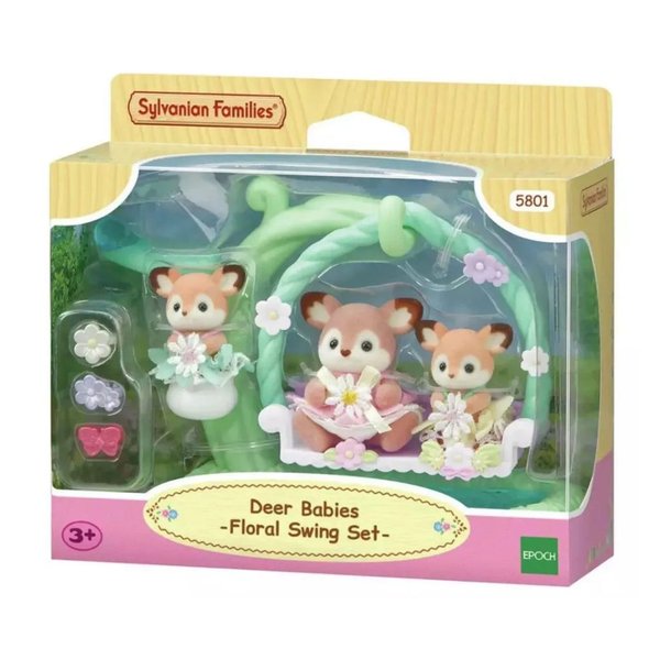 A família Cervo tem orelhas grandes e adoráveis. Este conjunto contém o bebê Cervo e bebês de berço em roupas florais combinando com um balanço de hera e um berço de lírio-do-vale. Os bebês podem sentar no balanço perto da água ou no berço de lírios do vale. Os bonecos têm cores e padrões de orelhas diferentes! Os bebês de berço são cor de caramelo e o bebê tem cor de cacau com orelhas com padrão de pétalas. Há decorações de orelhas em forma de flores e borboletas para os bebês usarem. Os bebês também podem sentar na folha, que tem uma gota de água transparente.
