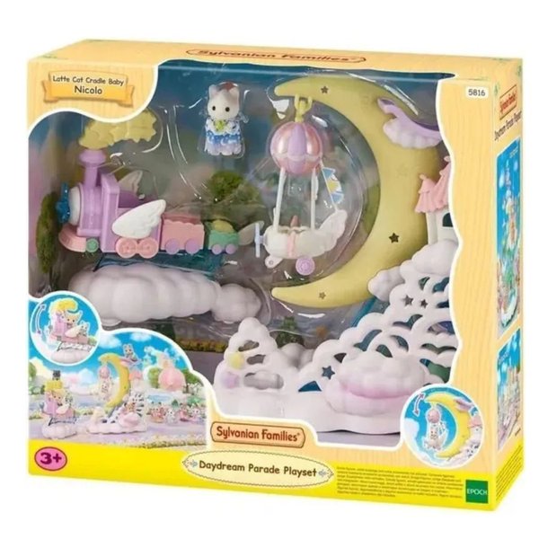 Um conjunto contendo um flutuador lunar, trem a vapor, nave espacial bebê e o bebê embalado Latte Cat. Conecte o trem a vapor e a nave espacial lua e faça um desfile! O trem a vapor balança para cima e para baixo conforme se move. A lua balança, e a nave espacial onde as figuras de bebês embalados podem sentar balança com ela! A nave espacial pode ser separada da lua e usada separadamente. O bebê embalado Latte Cat está usando uma roupa com um motivo de estrela cadente para combinar com este conjunto. Muitos bebês e figuras de bebês embalados podem sentar no flutuador lunar e no trem a vapor.