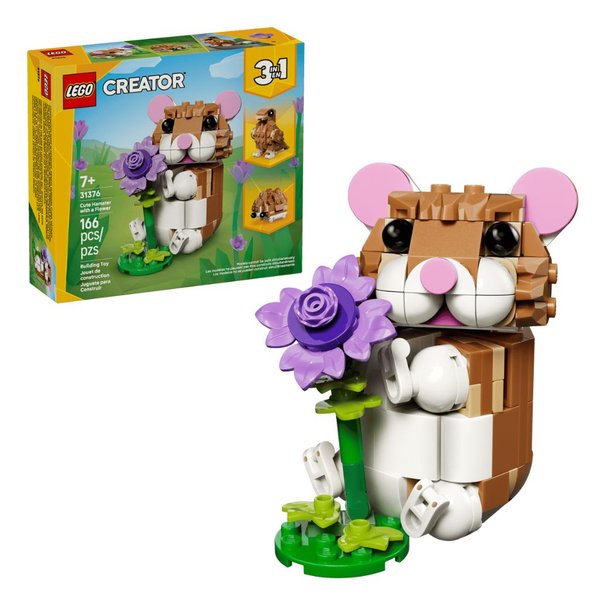 Meninos e meninas a partir de 7 anos que amam animais podem criar histórias divertidas com este brinquedo de construção LEGO® Creator 3 em 1 Hamster Fofo com Flor (31376). Este adorável conjunto de animais oferece 3 opções de construção diferentes com o mesmo conjunto de peças. As crianças podem escolher construir um hamster de brinquedo com cabeça e patas dianteiras articuláveis e uma flor roxa. Também podem reconstruí-lo em um ouriço de brinquedo com uma flor, ou em uma águia articulada com seu ovo no ninho.