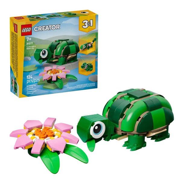 O conjunto de construção LEGO® Creator 3 em 1 Tartaruga com Flor de Lírio-d'água (31377) permite que crianças a partir de 7 anos criem histórias com animais. Este adorável brinquedo para meninos e meninas oferece 3 opções de construção diferentes com o mesmo conjunto de peças. As crianças podem optar por construir uma tartaruga com cabeça e boca articuladas, que vem com uma linda flor de lírio-d'água rosa. Esta pode ser reconstruída em um camaleão com cabeça e cauda articuladas, ou em um sapo com boca que se move.