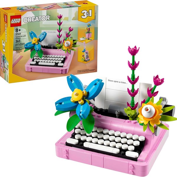 Brinquedos LEGO® Creator – Cada conjunto 3 em 1 permite que as crianças construam 3 modelos diferentes inspirados em algumas de suas maiores paixões, incluindo animais, veículos e casas. Medidas – O conjunto floral reconstruível de 363 peças apresenta uma máquina de escrever com flores de brinquedo medindo mais de 5 pol. (13 cm) de altura, 4 pol. (11 cm) de comprimento e 6 pol. (16 cm) de largura.