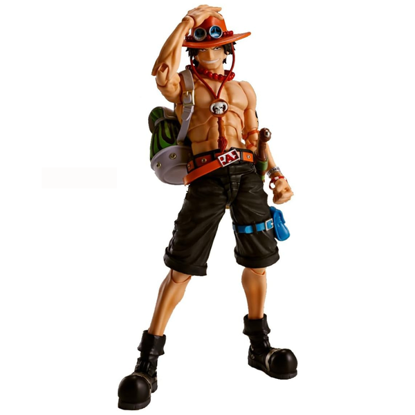 Figura articulada com mãos e rostos extras, com roupão de pano e efeitos de fogo.