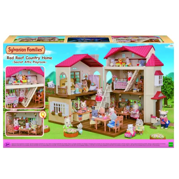 Casa grande com telhado vermelho, luzes e sótão secreto, oferecendo múltiplas opções de brincadeira e espaço para os personagens Sylvanian Families.