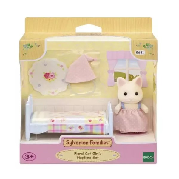 Conjunto Cama - Menina Gato Primavera, vem com uma cama e uma variedade de acessórios para dormir.