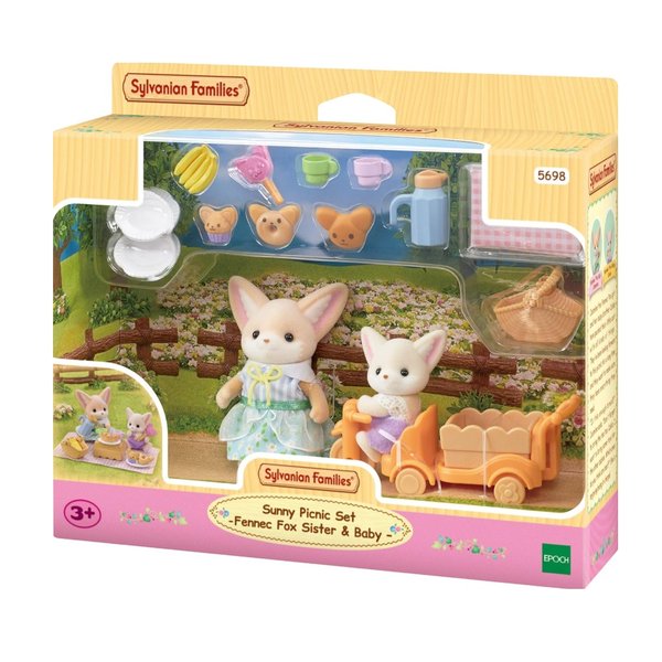 O Conjunto Piquenique Ensolarado - Irmã e Bebê Raposas-do-deserto – inclui membros da Família das Raposas-do-deserto, conhecidos por toda a parte por suas orelhas grandes e pontudas. Inclui a Menina e o Bebê Raposa-do-deserto, junto de um carrinho de passeio e equipamento para piquenique. *Vem com pãezinhos em forma de Raposa-do-deserto, donuts, bombons e cupcakes. *A cesta do carrinho de passeio pode ser removida para abrir espaço para que o bebê entre nele também. *O conjunto inclui a Menina Raposa-do-deserto, Jasmine, seu irmão Bebê, Caleb, junto de um carrinho de passeio e equipamento para piquenique. *Apresentando a Menina Raposa-do-deserto, Jasmine, e seu irmão Bebê, Caleb.